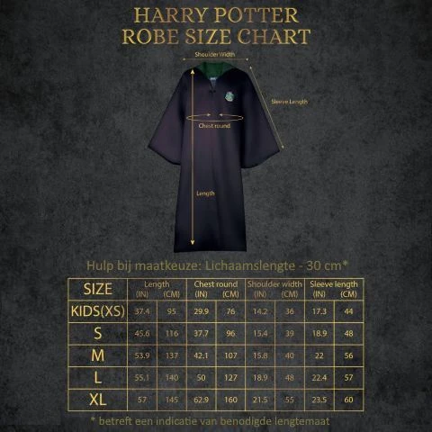 Om te bepalen welke maat je van de Ravenclaw robes nodig gaat hebben bekijk je het tweede plaatje met de maattabel.