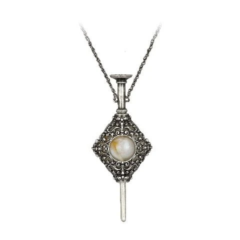 Deze verzilverde replica is versierd met fijne details en heeft een grootte van 8 cm en wordt geleverd met een ketting van 45 cm.