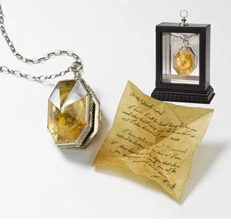 De hanger uit de Relieken van de dood (Deathly Hallows) was een Gruzielement (Horcrux), maar deze werd in de grot vervangen, door de mysterieuze RAB, voor deze replica die later door Harry en Perkamentus gevonden zou worden. Deze replica wordt geleverd met een mooie display.