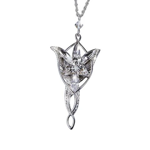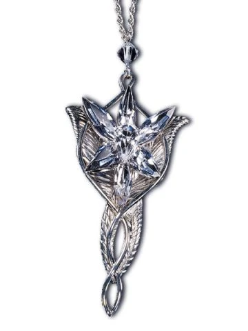 Een van de mooiste stukken uit Lord of the Rings is de Evenstar. Dit juweel gaf Arwen het eeuwige leven. Arwen werd verliefd op Aragorn en zij wilde haar sterfelijkheid voor hem opgeven en gaf daarom dit juweel aan hem. In het avontuur dat Aragorn daarna aanging heeft hij de Evenstar ook gedragen. Nu heeft Noble Collection ook een Sterling zilveren versie van dit stuk gemaakt. Inclusief ketting.